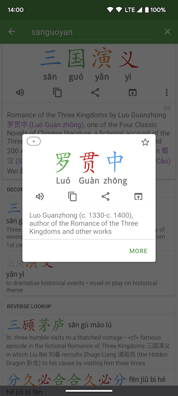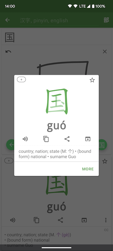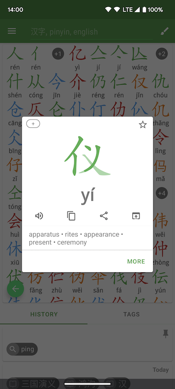 - Tapping on a character shows a popup for that character, including stroke animation (where available) as well as buttons to star/tag/play audio etc. This replaces the old behavior which was to show all the sub-words starting from that character.