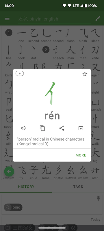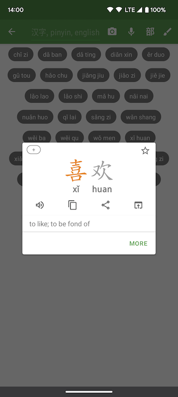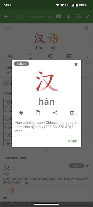 - Tapping on a character shows a popup for that character, including stroke animation (where available) as well as buttons to star/tag/play audio etc. This replaces the old behavior which was to show all the sub-words starting from that character.