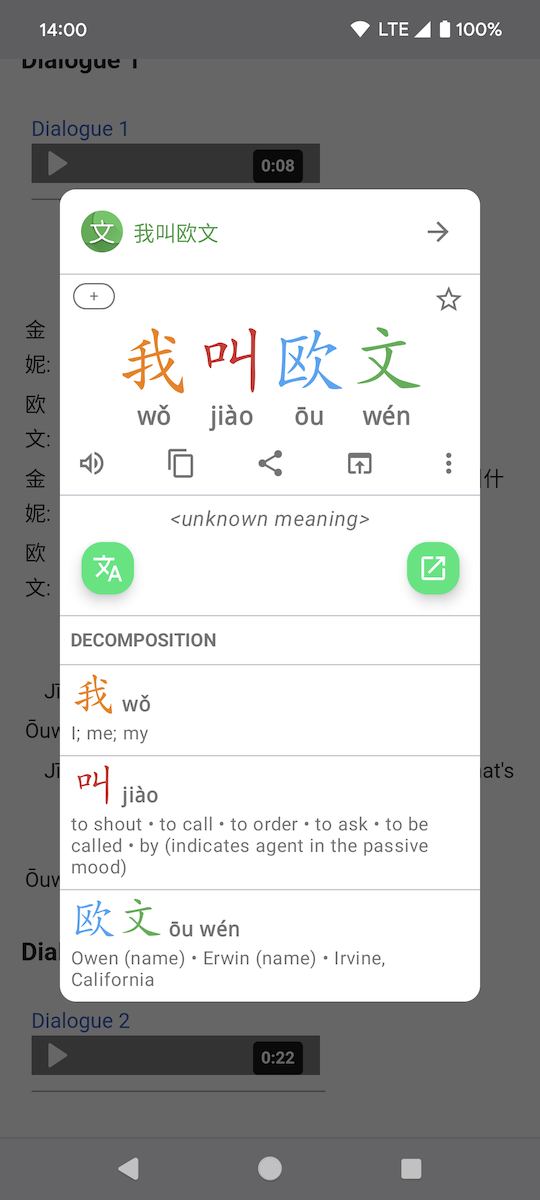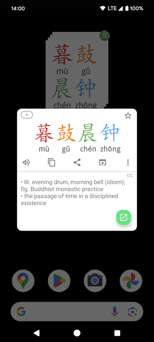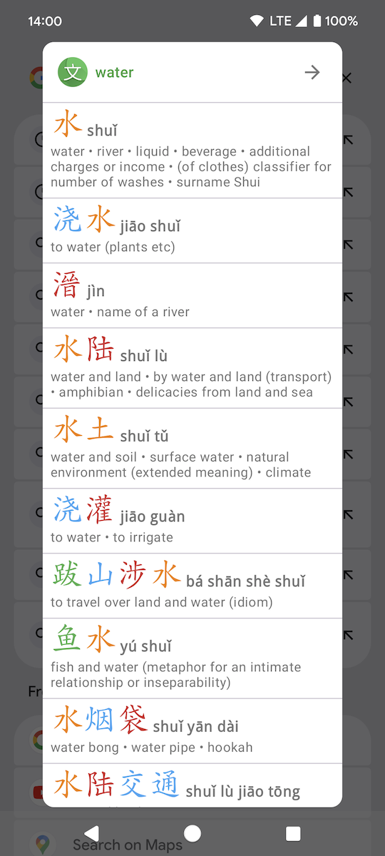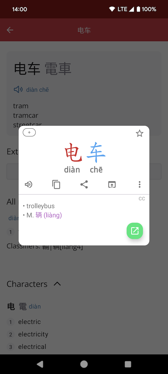 Word Search popups When searching for a word (Chinese or English - for example when selecting text in any app, or using Quick Settings Tile - see below) the results are shown as a list of words (with definition summaries). However, if there is only one word in the list, then the full popup for that word is shown instead. Tapping on a word in a list brings up the word popup and so on. Use the top-right arrow to jump to the full app using the same search.