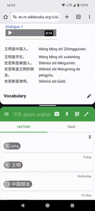 Added support for drag-and-drop text from other apps to Hanping (e.g. split screen mode). Enter split-screen mode on your device and then drag-and-drop text from third-party app (e.g. Chrome) into either Hanping’s Search Box or main screen area. When dropping the text on the Search Box, it will append to any existing search text.