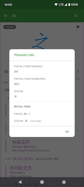 - Add Phonetic Info dialog (including initial-final breakdown) to overflow menu on word details screen. Can also access this dialog by tapping on single-syllable word’s phonetic